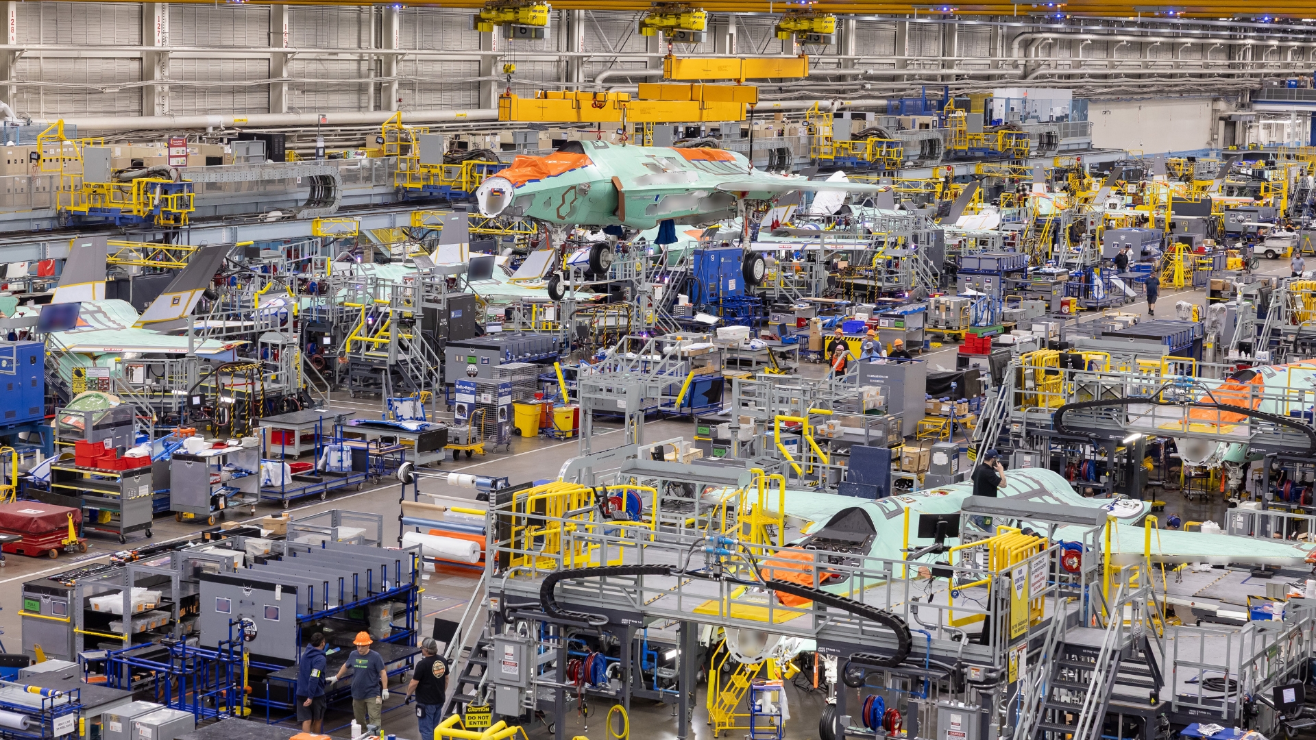Germany’s first F-35A is carried by an overhead crane to the final assembly station (Photo by Lockheed Martin photographer Chris Hanoch)